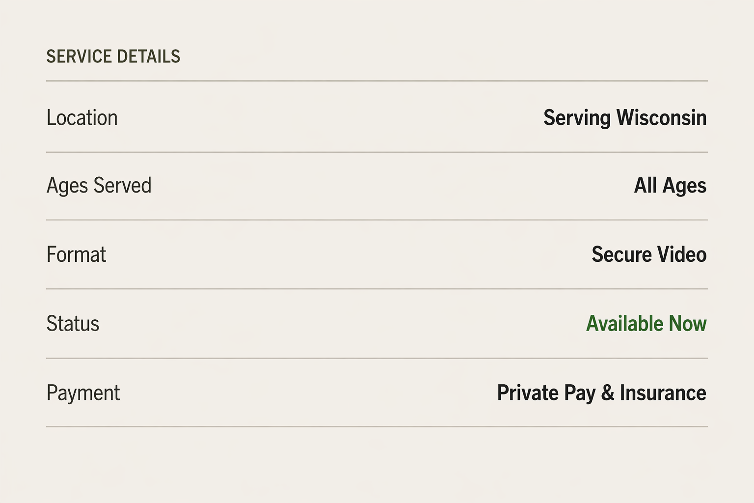 All telehealth sessions are conducted through a HIPAA-compliant, encrypted video platform. No session is recorded without your explicit written consent.